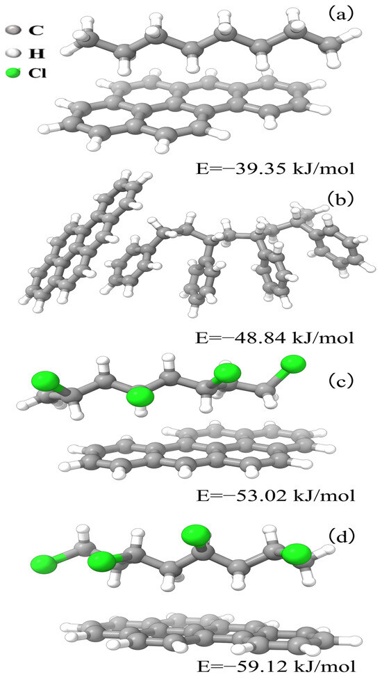 Figure 5 displays the molecular models and binding energies of BaP with the three types of microplastics (PE, PS, and PVC). The binding energy of PE with BaP is −39.35 kJ/mol; Figure 5a indicates a weak interaction, primarily through van der Waals forces, which limits the adsorption capacity of BaP under environmental conditions. In combination with Figure 3, it can be seen that the microplastics after soil treatment also bind BaP through van der Waals forces. The binding energy of PS with BaP is −48.84 kJ/mol. Figure 5b shows that PS, with its aromatic ring structure, can form stronger π–π interactions with BaP, resulting in a stronger adsorption capacity. Figure S3 shows that soil pretreatment with microplastics enhances π–π interactions, the microplastics pretreated with soil provided more sorption binding sites for BaP, thereby facilitating the attachment of BaP to the microplastics [36]. Moreover, the binding energy of PVC with BaP is −53.02 kJ/mol. Figure 5c combined with Figure S4 shows that the polar chlorine atoms in PVC enhance van der Waals and dipole–dipole interactions. After soil pretreatment, the microplastics formed stronger π–π interactions with BaP, with a binding energy of −59.16 kJ/mol, and Figure 5d shows the strongest interaction. After soil pretreatment, the BaP adsorption mechanism of the PVC microplastics shifts from dipole–dipole interactions to π–π interactions, and research has shown that after aging in soil, the adsorption of organic pollutants by microplastics shifts from hydrophobic and π–π interactions to hydrogen bonding and π–π interactions [19].
