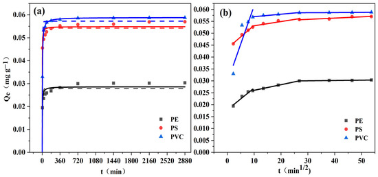 Adsorption kinetics of BaP on PE, PS, and PVC microplastics. The initial concentration of BaP was 1 mg L−1 and the background solution was 0.01 mol L−1 CaCl2. (a) The dashed and solid lines in the figure represent pseudo primary and pseudo secondary kinetic model fits, respectively, and (b) the solid line in the figure represents the intra-particle diffusion model fit.