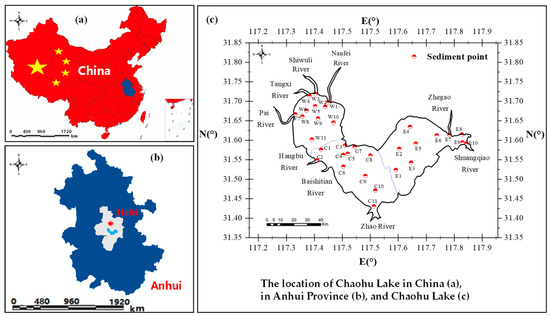 Chaohu Lake, a large shallow lake in one of the most economically developed regions in China, the Yangtze River basin, has increased trace metal accumulation in sediments due to intensified human activities, leading to elevated concentrations and total amounts of trace metals in sediments [21,22]. The ecological risk of trace metals to the aquatic ecosystem, especially to aquatic organisms, has become crucial [23,24]. Its unique hydrological characteristics and ecological importance make it an ideal site to assess the environmental risks of heavy metal pollution. In this study, focusing on aquatic organisms, we applied the SSD method to assess the ecotoxicological risk of trace metals in surface sediments, using trace metal concentration data from sediment samples and toxicity data from the US EPA’s ECTOX database. We particularly investigated the spatial variation in the ecotoxicity risk of trace metals in sediments across different regions and seasons. Through this study, we aim to gain further insights into the overall trend of the ecological risk posed by trace metals in sediments to aquatic organisms in Lake Chaohu and other similar large shallow lakes.