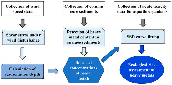 The representative trace metal content of the sediment surface can be obtained by arranging 32 core sediment sampling sites in Lake Chaohu. The ecotoxicological risk of trace metals in sediments to aquatic organisms can be assessed by studying different sediment re-suspension depths to analyze the concentration of trace metals released into water bodies and combined with the most reasonable SSD curve selected. The specific research paths and methods are shown in Figure 2.
