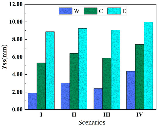 Figure 3 shows that the sediment TSS is highest in scenario IV, followed by scenario II, then scenario III, and it is lowest in scenario I. Additionally, in each scenario, the sediment TSS in the eastern region is larger than that in the central region, and sediment TSS is the lowest in the western region. The primary reason for this is that the average water depth in a shallow lake fluctuates little throughout the year, making wind action the major factor influencing sediment resuspension. The stronger the wind and waves, the greater the shear stress acting on the sediment, leading to a deeper resuspension depth.