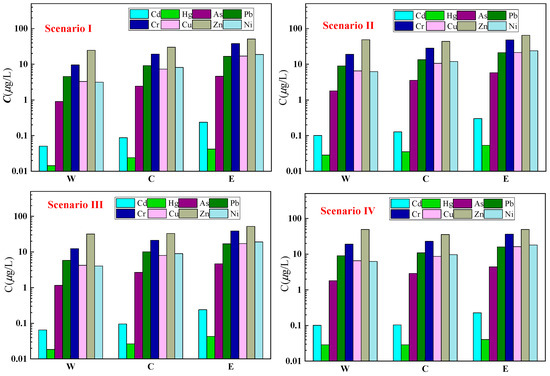 Finally, based on the proportion of trace metals released into the water column from each region Mi and using the calculation methods from Equations (4) and (5), along with the relevant basic data, the concentration of trace metals released into the water for each scenario Ci can be calculated (Figure 4).