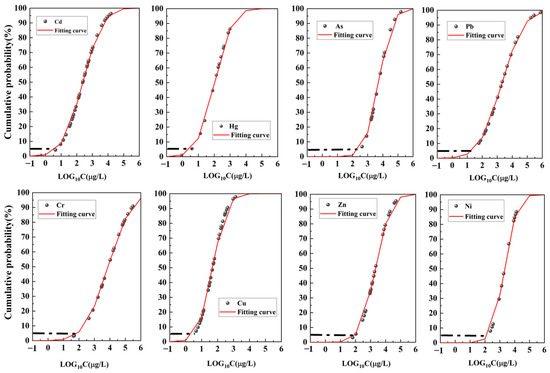 From the SSD curves for the eight trace metals shown in Figure 5, the HC5 values for all relevant species in the water can be determined. The calculated HC5 values for Cd, Hg, As, Pb, Cr, Cu, Zn, and Ni are 5.25, 3.70, 330.58, 21.58, 80.87, 3.33, 96.12, and 161.51 μg/L, respectively. The results indicate that the toxicity to all species, from highest to lowest, is in the order of Cu, Hg, Cd, Pb, Cr, Zn, Ni, and As. These findings are consistent with the HC5 values and toxicity patterns of trace metals in the Yangtze–Huaihe River Basin [15,16].