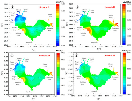 Using Equation (8), the combined ecological risk for the 32 sampling points in Lake Chaohu under four different scenarios was calculated, and a spatial interpolation was performed to show of the spatial ecological risk contribution rate for the entire lake (Figure 7).