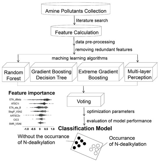 It is essential to develop a rapid method for assessing whether amines undergo N-dealkylation biotransformation mediated by CYP450. This is crucial for evaluating the environmental health risks of emerging amine pollutants. With the growing amount of experimental data and advancements in high-performance computing, various machine learning algorithms have shown strong classification performance and significant potential for applications in identifying sources of environmental pollutants and predicting their toxicity [,,]. Machine learning methods that utilize descriptors to predict compound properties are straightforward, reliable, and do not necessitate extensive training. These algorithms are computationally cost-effective, enabling them to run efficiently on standard computer systems. However, unlike drug metabolism predictions, there are currently few machine learning models that take into account the key biotransformation pathways of pollutants. Additionally, there is no existing dataset specifically for CYP450-mediated biotransformation of amine pollutants (N-dealkylation). Furthermore, many machine learning algorithms are often criticized for their “black box” prediction process, which lacks sufficient interpretability [].