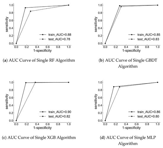 To assess the performance of the individual models, Table 3 and Table 4 present the accuracy, sensitivity, specificity, precision, F1 score, and Matthews correlation coefficient values for both the training and testing sets. Additionally, the results of the corresponding receiver operating characteristic curve and the area under the curve are displayed in Figure 3. The results indicate that the Matthews correlation coefficient values for the test sets of four classification models are all higher than 0.56. Furthermore, the corresponding receiver operating characteristic curves are located in the upper left corner, and the area under the curve is greater than 0.78. These findings suggest that the prediction results of these four classifiers have substantial predictive value. Among the four machine learning classifiers, the GBDT and XGB prediction model demonstrate superior performance. GBDT achieved an accuracy of 81.0%, while XGB reached 79.3%. Additionally, GBDT had a lower false negative rate of 4.0%, and XGB had an impressive false negative rate of 0.0%.