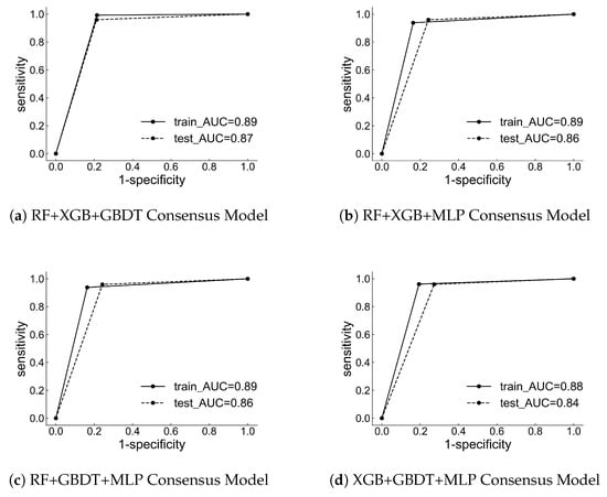 Since each machine learning model predicts a different set of compounds, this study employs an approach that integrates the results of these individual models to leverage their strengths and enhance overall predictive performance. The study combines the individual models in various configurations using a soft voting-based strategy. In this method, the final class label is determined by weighing the predicted outcomes according to the accuracy rate of each base classifier. Table 5 and Table 6 present the accuracy, sensitivity, specificity, precision, F1 score, and Matthews correlation coefficient values for both the training and testing sets of the different soft voting models. Additionally, the corresponding receiver operating characteristic curve and the area under the curve are displayed in Figure 5.