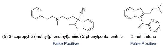We performed a misclassified analysis of the best consensus model results by categorizing the false positive (FP) and false negative (FN) errors based on our features. In the test set, the best consensus model misclassified a total of nine amines, resulting in eight false positives and one false negative. Among these, six amines had descriptor values that exceeded the mean ± standard deviation of the compounds in the training set. Figure 6 illustrates the characteristics of the remaining two amine compounds that were misclassified by the best consensus model, even though their descriptors fell within the mean ± standard deviation range. Both of these compounds are classed as false positives. This suggests that the model’s misclassifications are more likely to result in false positive errors.
