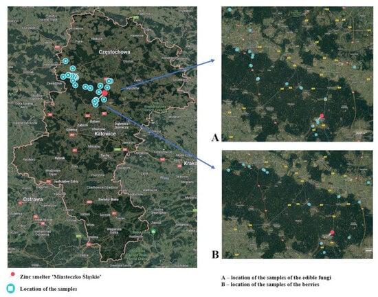 Exposure to heavy metals is considered one of the most pressing environmental issues in both industrialized and developing countries []. For the general population, the most significant route of exposure to metals is through food. Edible plants, mainly vegetables and cereal products, account for the highest intake of metals such as cadmium, lead, and zinc []. At the same time, fish and seafood are the primary sources of mercury exposure []. Edible mushrooms and forest berries are also potential sources of exposure to toxic metals for the human body. The hyphae of edible mushrooms demonstrate high capabilities for accumulating heavy metals, especially when they grow in soils heavily contaminated with metals []. Metal accumulation also occurs, although to a lesser extent, in fruits of plants that make up the forest ground cover. The research for this study was conducted in the Silesian Voivodeship, located in southern Poland, within the influence area of the zinc smelter ‘Miasteczko Śląskie’ S.A., where the prevailing winds are west and south-west. The average wind speed in this area is V = 2.92 m/s, with the strongest winds from the south-west (V = 3.92 m/s) and west. Poland is situated in Central Europe, in a temperate climate zone, with an average annual temperature of 9.5 °C and an average annual rainfall of 534.4 mm []. The Silesian Voivodeship is the most heavily polluted region with heavy metals in the country, housing the extensive forest complex known as the ‘Lasy Lublinieckie’ (Lubliniec Forests). The complex is part of the forest protection belt established in 1968 within the Upper Silesian Industrial Region, intended to neutralize the harmful impact of industry []. Overall, the forest area in Poland at the end of 2021 was 9264.7 thousand hectares, constituting 29.6% of the country’s total land area []. The Lubliniec Forests complex covers an area of almost 100 thousand hectares, of which 82% are pine forests. The forest substrate contains small amounts of mineral resources such as iron ore. There are three types of soils in the complex: swamp soils, podzols, and rusty soils, and typical brown soils. The Lubliniec Forests, together with the Rybnik and Pszczyna forests, belong to the so-called Forest Protection Belt of the Upper Silesian Industrial Region and are considered to be the so-called ‘Lungs of Silesia’ []. The studied area has been associated with mining and processing of non-ferrous metal ores for centuries. Extraction of non-ferrous metal ores ceased in the 1920s []. Currently, the only active industrial plant dealing with the processing of non-ferrous metals is the zinc smelter ‘Miasteczko Śląskie’ S.A. The feedstock contains a mixture of zinc-lead concentrates (zinc blende and galena), which is used in obtaining zinc and lead by the Imperial Smelting Process (ISP). In addition to useful components such as zinc and lead sulfides, the feedstock also contains ores such as pyrite, rich in arsenic, thallium, cobalt, nickel, copper, barium, magnesium, and strontium. Consequently, the dust emitted into the environment contains significant amounts of toxic elements []. As a result, environmental pollution, particularly of soils with heavy metals, occurs [,].