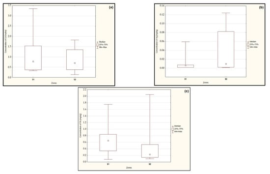 The average lead content in the examined mushrooms was 0.60 mg/kg, whereas the highest permissible concentration reached 0.80 mg/kg f.m. []. In ten samples, the metal content did not exceed the limit of quantification (LOQ < 0.08 mg/kg f.m.). Elevated concentrations were found in four samples. The most heavily contaminated samples were the Suillus luteus: 1.75 and 2.05 mg Pb/kg f.m. (Table 2 and Table S2). The average lead concentration in mushrooms collected from locations within a 15 km radius (S1) of the zinc smelter was 0.68 mg/kg fresh weight. Only in one sample was the lead content lower than the limit of quantification (LOQ). Lead concentrations exceeding the maximum allowable limit were found in three mushroom samples. The average lead concentration in mushrooms from zone S2 (more than 15 km) was 0.51 mg/kg f.m. Only one sample had a lead content exceeding the maximum permissible level, while in nine samples the metal concentration remained below the limit of quantification (LOQ).