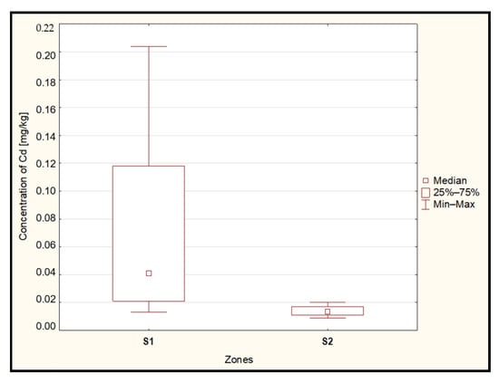 The statistical analysis conducted using the Mann–Whitney U test revealed significantly higher cadmium concentrations (p = 0.002) in the examined blueberries originating from the zone located within 15 km (S1) of the ‘Miasteczko Śląskie’ zinc smelter compared to samples collected from the area located more than 15 km away from the source of heavy metal emissions (S2) (Figure 3).