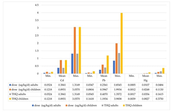 The threshold dose values are presented in Table 1. If the calculation result equals or exceeds unity (HQ ≥ 1), it is considered that exposure to the specific element poses a significant health hazard. However, when the hazard quotient value is less than unity (HQ < 1), the exposure is considered insignificant in terms of non-cancer health risk. The uncertainty analysis of the modelled Ingested Dose and Hazard Quotient values was conducted by dividing the standard deviation by the square root of the number of measurements. Cancer risk (CR) was calculated for cadmium by multiplying the ingested dose with a cancer slope factor (SF), which is defined as a plausible upper-bound estimate of the probability of a response per unit intake of the chemical over a lifetime. The value of SF for Cd is 380 µg/kg/day [].