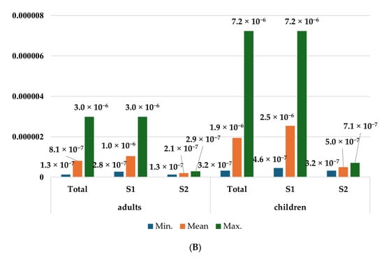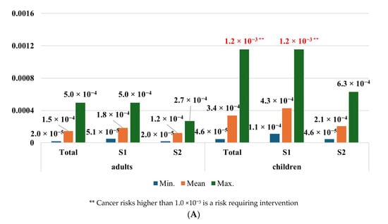 Cancer risks in the range of 1.0 × 10−6 to 1.0 × 10−4 are acceptable, higher than 1.0 × 10−4 is considered unacceptable, but greater than 1.0 ×10−3 is a risk requiring intervention. The statistical analysis of the results was conducted using Statistica software (StatSoft Polska Sp. z o.o., Kraków, Poland) version 13.3. The normality of the distribution of the variables was assessed using the Shapiro–Wilk test, and the Mann–Whitney U test was used in further statistical analyses. A significance level of p < 0.05 was adopted for all tests.
