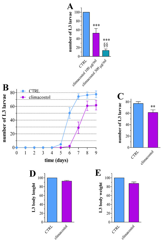 Climacostol impairs Drosophila development. (A) The number of third instar larvae developed from mating adults both in the absence (control, CTRL) and in the presence of increasing concentrations of climacostol in the food. Results are expressed as the percentage of CTRL larvae. *** p < 0.0001 vs. CTRL; §§ p < 0.001 vs. 100 µg/mL climacostol. Data have been obtained from 5 independent experiments. (B) Time from fertilized eggs (100) to third instar larvae eclosion represented by cumulative number of larvae emerging from CTRL food and food supplemented with 100 µg/mL climacostol. (C) Number of eclosed third instar larvae on day 8–9 of egg treatment. ** p < 0.001 vs. CTRL. Data have been obtained from 8 independent experiments. (D) Body length and (E) body weight of eclosed third instar larvae. Results are expressed as the percentage of body traits in CTRL group. Data have been obtained from 8 independent experiments (50 animals).