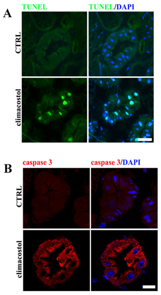 Climacostol-induced damage in Drosophila midgut. Confocal microscopy imaging of TUNEL labeling (A) and cleaved caspase 3 immunostaining (B) in midgut sections of third instar larvae eclosed both in the absence (control, CTRL) and in the presence of 100 µg/mL climacostol. DAPI was used for nuclei detection. Scale bars: 50 μm. Images are representative of 20 animals obtained from 4 independent experiments.