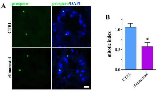 (A). Confocal microscopy imaging of prospero immunostaining in midgut sections of third instar larvae eclosed both in the absence (control, CTRL) and in the presence of 100 µg/mL climacostol. DAPI was used for nuclei detection. Scale bar: 20 μm. Images are representative of 15 animals obtained from 3 independent experiments. (B) Mitotic index analysis in brains from the third instar larvae. Results are expressed as fold change in CTRL. * p < 0.01 vs. CTRL. Data have been obtained from 4 independent experiments (15 animals).