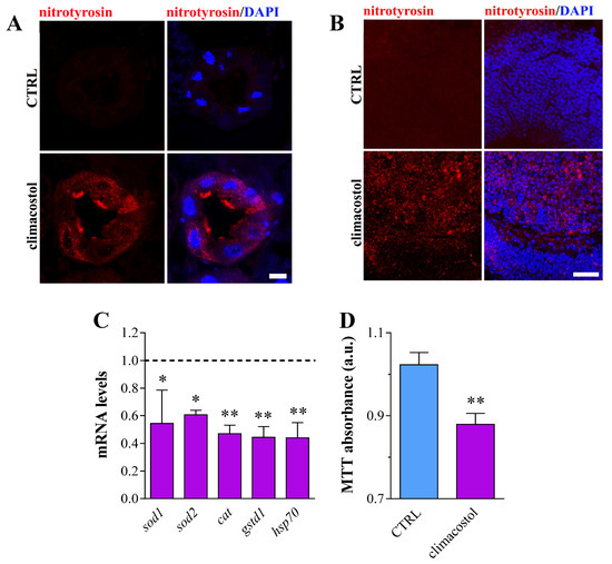 Climacostol affects redox homeostasis of Drosophila. Confocal microscopy imaging of nitrotyrosine immunostaining in midgut (A) and brain (B) sections of third instar larvae eclosed both in the absence (control, CTRL) and in the presence of 100 µg/mL climacostol. DAPI was used for nuclei detection. Scale bars: 20 μm. Images are representative of 15 animals obtained from 4 independent experiments. (C) mRNA levels of sod1, sod2, cat, gstd1, and hsp70 genes by qPCR in third instar larvae eclosed in the presence of 100 µg/mL climacostol. Results are expressed as fold change in CTRL (dotted line). Data have been obtained from 4 independent experiments (20 animals). (D) Measurement of mitochondrial activity by MTT absorbance in third instar larvae. Results are expressed as arbitrary units (a.u.). Data have been obtained from 3 independent experiments (60 animals). * p < 0.01 and ** p < 0.001 vs. CTRL.