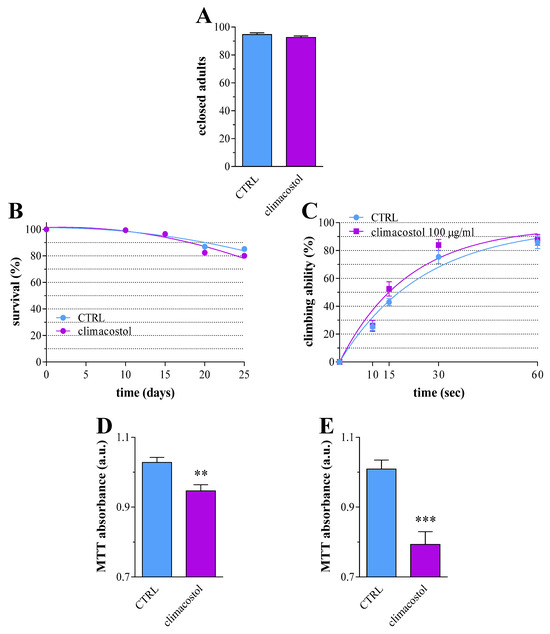 Long-term effects of climacostol in Drosophila. (A) Number of adults eclosed from third instar larvae developed in the absence (control, CTRL) and in the presence of 100 µg/mL climacostol in the food. Results are expressed as percentage of pupae. Data have been obtained from 3 independent experiments. Eclosed adults were then fed with a standard diet. (B) Survival of adults, evaluated by the total number of living flies during the experimental period. Results are expressed as a percentage of eclosed adults at day 0. Data have been obtained from 3 independent experiments (90 animals). (C) Climbing ability of adults on day 20 after eclosion. The number of flies that climbed up to the 15 cm mark at 10, 15, 30, and 60 sec was recorded and expressed as the percentage of success rate. Data have been obtained from 3 independent experiments (60 animals). Measurement of mitochondrial activity by MTT absorbance in adults at day 10 (D) and 20 (E) from eclosion. Results are expressed as arbitrary units (a.u.). Data have been obtained from 3 independent experiments (60 animals). ** p < 0.001 and *** p < 0.0001 vs. CTRL.