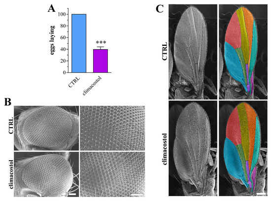 In this respect, climacostol diets were identified as affecting Drosophila oviposition. Indeed, when F1 offspring adult females (eclosed from both control and climacostol-treated eggs and then fed a standard diet) were collected as virgins before copulation, the number of laid eggs in the climacostol group was significantly lower than the control (Figure 6A). However, the climacostol-fed larvae upon reaching adulthood (both F1 and F2 generations) did not develop structural abnormalities. Indeed, as revealed by SEM studies, the compound eyes and wings of the F1 and F2 adults maintained a unique and stable pattern without alterations in morphology and symmetry (Figure 6B,C).