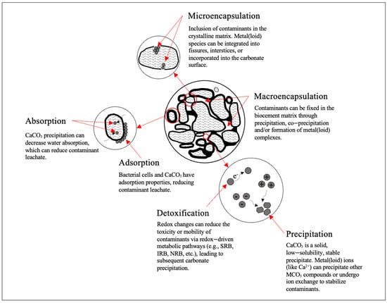 - Redox potential changes: The speciation state can influence oxidation, reduction, mineralization, and immobilization [100]. Certain metal(loid)s are more stable under reducing conditions or oxidizing conditions. Therefore, redox changes can cause the dissolution of precipitates over time. While urease-driven MICP is not readily influenced by redox potential [42], sulfides and iron oxides are easily reactive with redox potential changes [46]. It is possible that immobilized metal(loid)s can be redissolved [46]. The impact of chemical speciation and redox changes should be studied with respect to time to assess their long-term impact.