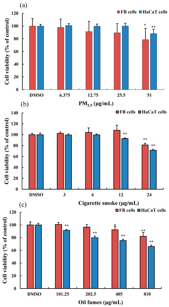 Effect of PM2.5 on the viability of FB and HaCaT cells. (a): the organic extracts of fine particulate matter (PM2.5); (b): the organic extracts of cigarette smoke (CS); and (c): the organic extracts of cooking oil fumes (COFs). Data are shown as the mean ± standard deviation (SD) of six parallel samples. * p < 0.05, ** p < 0.01, compared with the negative control (0.1% DMSO).