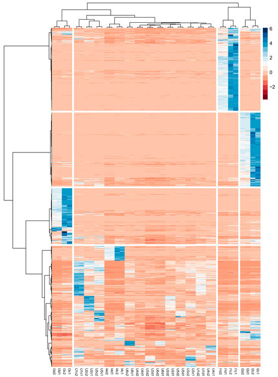 HCA was applied to the 40 × 9681 dataset using the Euclidean distance and Ward’s linkage method. HCA was applied to both the samples and the variables to obtain a so-called two-way clustering heatmap, as shown in Figure 1.
