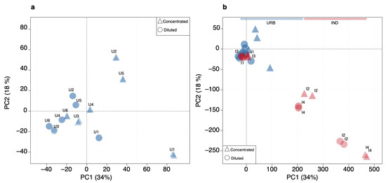 PCA score plots (PC1, explaining 34% of the total variance, vs. PC2, explaining 18% of total variance) of the urban dataset (URB) (a) and including the projection of industrial samples (IND) (b).
