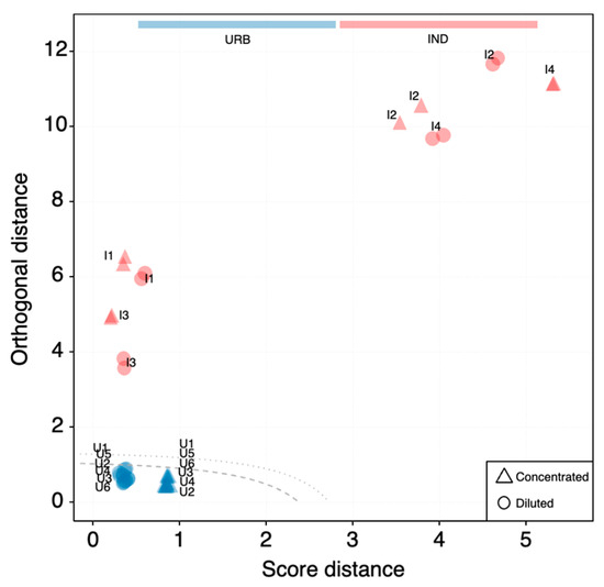 The detection of the anomaly of the new incoming industrial data was then revealed by visual analysis of score distance (SD) and orthogonal distance (OD) from the centroid of the covariance data structure [34]. The number of principal components to retain was selected using Kaiser’s rule and by looking at the explained variance scree plot. The distance–distance plot constructed for the PCA model with 6 PCs is shown in Figure 3. Samples are placed in accordance with their SD and OD values. In general, samples with high SD values are close to the PCA space but far from the model center, and samples with high OD values are far from the PCA space with large residuals, but their projection may be within the model. The dashed line represents the critical limit for extreme objects (defined by a significance level α, set to 0.05); the dotted line represents the critical limit for outliers (defined by the significance level γ, set to 0.05). The two lines can be used to decide whether a sample should be considered as part of the urban samples’ population or not. All the industrial samples (in red) are easily identified as outlying samples, while the small dissimilarity between the concentrated (triangles) and diluted (circles) urban samples is easily recognized along the SD axis despite remaining within the critical limits. By interpreting these results with respect to mass spectrometry fingerprinting, it can be said that higher SD values reflect different intensity levels of the same chemical characteristics. Industrial samples with both high OD and SD values deviate in the existence and ratios of chemical compounds (overall pattern) from the urban baseline characteristics. Interestingly, industrial samples I1 and I3, which were clustered together within the same cloud of all urban samples in the score plot of Figure 2b, had more or less the same SD values as the diluted urban samples but with much higher OD values.