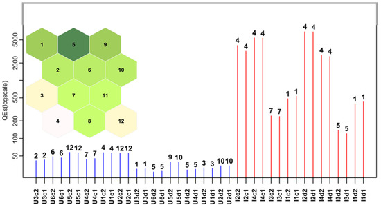 In Figure 5, the QEs (logscale), together with the BMU assignment both for urban and industrial samples, are reported. The BMU number code is shown in the map and is represented in the top left of the plot. It can be observed that the industrial samples show very high values of QEs, even the diluted ones. Thus, their identification as outliers is very easy.