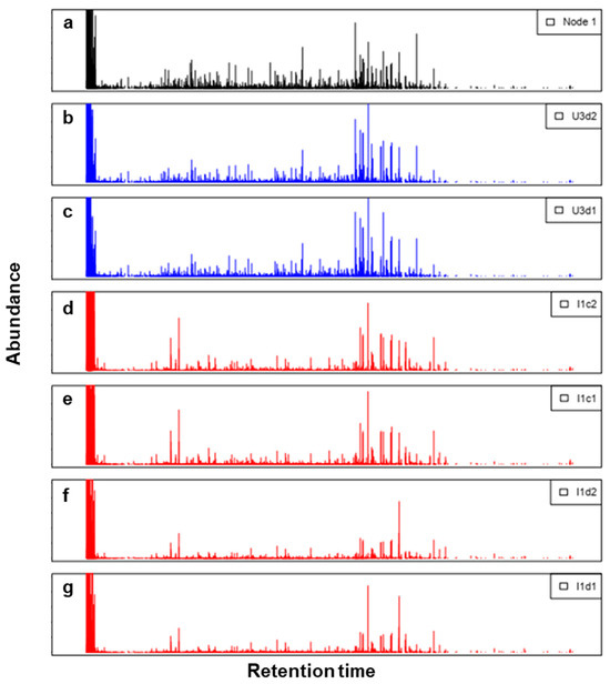 Stacked plots represent the following: (a) Node 1 signature recreated as a chromatogram (black). (b,c) Experimental urban signatures are assigned to that node (blue). (d–g) Industrial signatures are projected in that node (red).