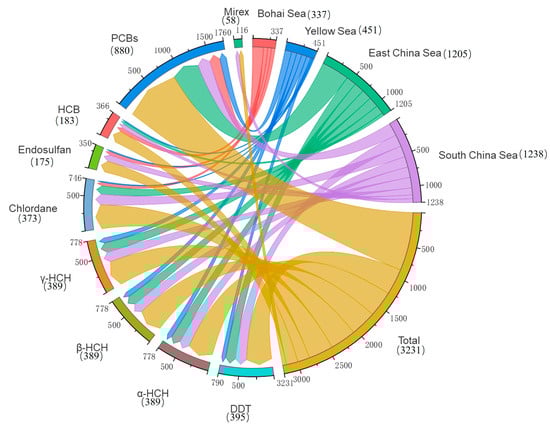 Pesticide pollution is very common. For example, organochlorine and other pesticide pollutants were detected in Cirebon [8], the East China Sea [9], and Xiangshan Bay [10] in Indonesia, and the total concentration ranges were 10–120 ng·L−1, 183.49–1363.77 ng·L−1, and 2.88–34.72 ng·L−1, respectively. Similarly, a variety of pesticide pollutants were also found in the sediments of the Ebro River Delta [11], the Vasai River in Mumbai [12], the iSimangaliso Wetland Park in South Africa [13], and the west coast of India [14], with concentration ranges of 50.8–1912 ng·g−1, 597–1538 ng·g−1, 26.29–283 ng·g−1, and 0.39–21.16 ng·g−1, respectively. In addition, PCBs and organochlorine pesticides were found in the sediments of Shantou Bay, China, with concentrations ranging from 0.54 to 55.5 ng·g−1 and 2.19 to 16.9 ng·g−1 [15]. Organochlorine pesticides were found in the sediments of areas of North Bohai Sea, China, and concentrations of HCH and DDT in sediments ranged from below detection (<LOD) to 1964.97 ng·g−1 and <LOD to 86.46 ng·g−1, respectively [16]. PCBs were found in the Jiaojiang Estuary of the East China Sea, with concentrations ranging from 4.93 ng·g−1 to 108.79 ng·g−1 [17].