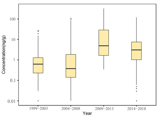 In the formula, RQ is the risk quotient, dimensionless; C is the average concentration calculated from the measured value set of a single chemical, ng·g−1; and PNECsediment is the predicted no-effect concentration derived by the most sensitive toxicity data with assessment factors (Afs) of 10, 20, or 100 depending on test endpoints of NOEC or EC10, LOEC, or EC50 [31,39].