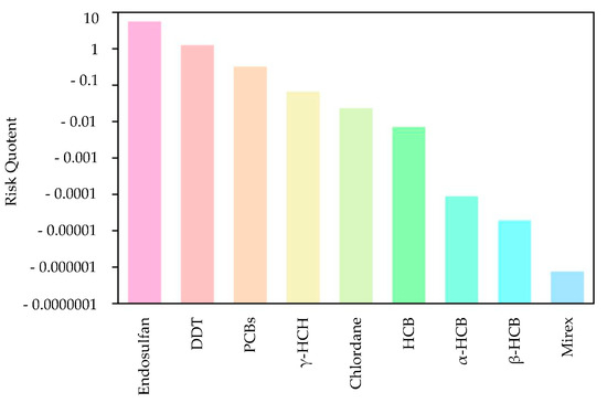 The ecological risk of pesticides in the aquatic environment is a topic of widespread concern around the world. For example, Guo et al. used the risk quotient method and the probabilistic risk assessment method to conduct an ecological risk assessment of organochlorine pesticides in the surface waters of Meiliang Bay, Gonghu Bay, and Huikou Bay in Taihu Lake [18]. The results showed that DDT, endosulfan, and hexachlorocyclohexane (HCH) presented relatively high risks. Xu et al. used the risk quotient method to assess the ecological risks of 35 pesticides in seven watersheds in China [19]. The results showed that the ecological risks of each watershed were at a potential medium level, and pesticides were the main compounds that posed risk. Hong et al. conducted an ecological risk assessment of DDT in pond sediments in the Yangtze River–Huai River region of China, and they found that there was a moderate to high ecological risk [20]. The results showed that the total content of PCBs and DDT posed a moderate ecological risk [21]. Zhao et al. conducted an ecological risk assessment of organochlorine pesticides and polychlorinated biphenyls in surface sediments of Tianjin Haihe Estuary based on sediment quality guidelines. The results showed that organochlorine pesticides and PCBs have potential ecological risks [22].