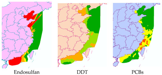 Risk map of three pesticide pollutants in China’s coastal sediments.