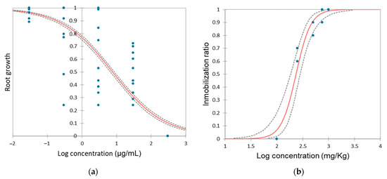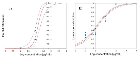 Dose–response curve for (a) Daphnia magna and for (b) Aliivibrio fischeri after 24 h and 30 min of exposure to hydroquinone, respectively. Red line represents the model and dashed lines indicate the confidence limits (95%). The points indicate the values of the replicates, in some cases the values may overlap.