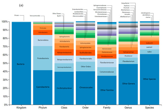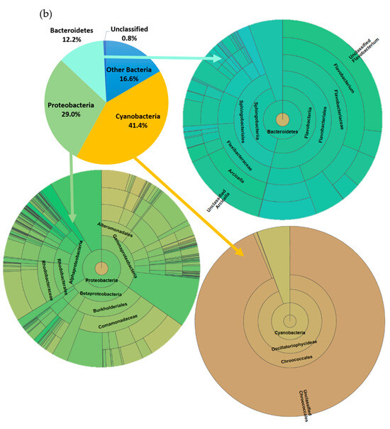 The Cyanobacteria phylogenetically belong to oxygenic phototrophic bacteria frequently found in rivers [74,75]. Almost all Cyanobacteria were classified within the class Oscillatoriophycidaeae (94.4%), with the majority falling under the order Chroococcales, a dominant group in freshwater biotopes [76].