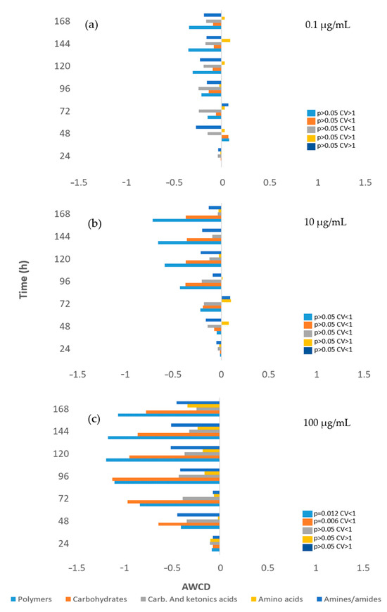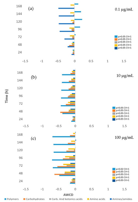 Metabolic effect differentiation by carbon sources of the river microorganisms exposed in different concentrations to hydroquinone with respect to the control (Y axis) ((a) 0.1 µg/mL; (b) 10 µg/mL; (c) 100 µg/mL). Each point is the average value of three replicates (Average Well Color Development-AWCD). The significance of differences from the control is indicated by p-values (t—Student), and the dispersion of values among the three replicates is represented by the coefficient of variation (CV).