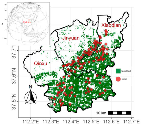The grid-point method was utilized for sample placement alongside the implementation of the GPS positioning system. Various factors were considered, such as the distribution and flow direction of irrigation channels, sewage water quality, soil types, and the history of sewage irrigation. A total of 110 sampling points were established, comprising of 35 points in Xiaodian Area, 35 points in Jinyuan Area, and 40 points in Qingxu County (Figure 1). Topsoil samples (0–20 cm) were collected in June 2020 using a plastic spade, carefully stored in PVC packages with labels, and subsequently transported to the laboratory. Following this, the soil samples were dried indoors, grinded with a porcelain mortar, sieved through a size 100 mesh, and stored in plastic bags.