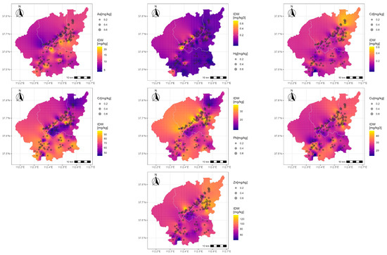 All statistical analyses and diagrams were conducted using R (version R 4.2.0, https://cran.r-project.org, assessed on 20 November 2023). The data cleaning (i.e., removing missing values) and collation (i.e., deriving variables) were performed using the “tidyverse” package. Descriptive statistics (including the maximum, minimum, mean, and variation coefficient in Table 1) and correlation calculation (indicating the pairwise correlation of seven heavy metal contents) were found using the “gtsummary” package. The principal component analysis was performed using the PCA method with the “rstate” package in R. The spatial interpolation of IDW was carried out using the ”sf ”package and “rspatial” package. All plots were drawn based on the “ggplot2” package of R.
