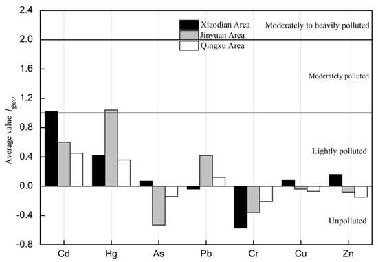 where Ci (mg/kg) represents the measured concentration of a specific heavy metal, while Bi (mg/kg) represents the geochemical background value of the element. In this study, Taiyuan city had the following corresponding values: 7.60, 0.03, 0.08, 57.30, 13.80, 18.40, and 56.30 mg/kg for As, Hg, Cd, Cr, Pb, Cu and Zn, respectively. The constant 1.5 accounts for the natural fluctuations of the metal in soil. The Igeo is classified into seven grades (0 to 6): Igeo < 0 indicates an unpolluted level, 0 ≤ Igeo < 1 represents lightly polluted level, 1 ≤ Igeo < 2 indicates a moderately polluted level, 2 ≤ Igeo < 3 represents a moderately to heavily polluted level, 3 ≤ Igeo < 4 indicates a heavily polluted level, 4 ≤ Igeo < 5 represents a heavily to extremely polluted level, and Igeo ≥ 5 represents an extremely polluted level.