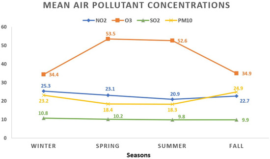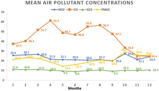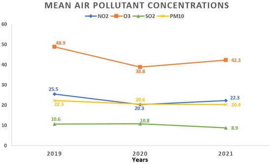 | NO2 (μg/m3) | O3 (μg/m3) | SO2 (μg/m3) | PM10 (μg/m3) | |||||