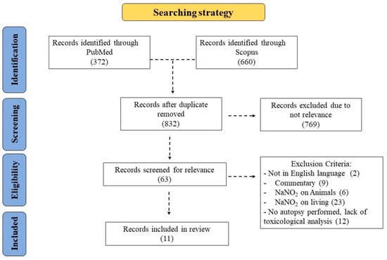 The present systematic review was conducted according to the guidelines of preferred reporting items for systematic reviews and meta-analyses (PRISMA) [,,] using the methodology described in the Cochrane Collaboration Handbook on Systematic Reviews of Health Promotion and Public Health Program [,]. The Prisma checklist has been followed for this systematic review. The data for this systematic review were gathered by searching for the articles reported in the literature in PubMed and Scopus (January 2000–December 2022). The search strategy mainly focused on articles based on autopsy diagnoses of fatal sodium nitrite intoxication. For the search, MeSH terms and free text words were combined through Boolean operators as follows: ((autopsy) OR (death) OR (suicide) OR (intoxication) OR (poison) OR (fatal)) AND ((sodium nitrite) OR (nitrite) OR (NaNO2) OR (nitrate)).