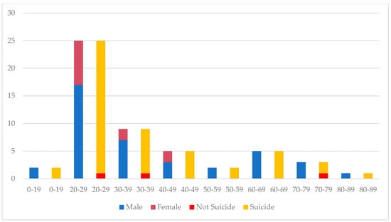 A total of eleven research articles were selected for qualitative and quantitative data. Most of the studies (6/11) were case reports. Fifty-three cases of fatal intoxication with sodium nitrite were chosen for the review. Most fatalities involved men (41/53, 77.3%) under fifty years old (41/53, 77.3%). Except for three cases (1 accidental ingestion/2 undetermined), the manner of sodium nitrite consumption was suicidal (Figure 2). In forty cases (75.4%), no information about the postmortem interval was present in the manuscript. An alteration in the color of the livor mortis was observed in thirty-six patients (67.9%). The most frequent autopsy findings were not specific: congestion, brain and pulmonary edema, and cyanosis. The crime scene was suggestive of sodium nitrite intoxication in most cases. According to Cvetkovic [], there was no evidence at the crime scene of sodium nitrite consumption. However, there was a positive history of the consumption of homemade sausage, and the toxicological analysis showed that the concentration of sodium nitrite in food was almost 30 times higher than what is allowed according to the legislation. Furthermore, the only specific and frequent findings at autopsy consisted of typical livor mortis color detection (blue, gray) (Table 1).