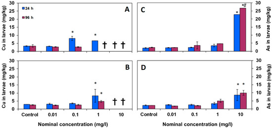 Mean values of copper and arsenic concentrations (mg/kg) in larvae of D. labrax with respect to the nominal concentration in water, after 24 and 96 h of exposure. (A) Cu, (B) Cu-NPs, (C) As, and (D) As-NPs (data are shown as means ± SD; symbols indicate significant differences as follows: (*) p < 0.05 vs. control; (#) p < 0.05 vs. 24 h). The crosses indicate that all larvae died at this concentration.