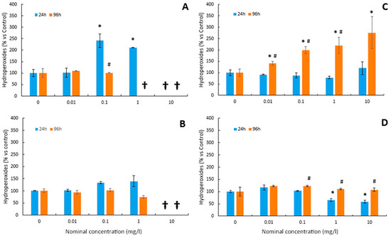 Mean values of hydroperoxides in larvae of D. labrax after 24 and 96 h exposure to (A) Cu, (B) Cu-NPs, (C) As, and (D) As-NPs (data are shown as means ± SD versus controls; symbols indicate significant differences as follows: (*) p < 0.05 vs. control; (#) p < 0.05 vs. 24 h). The crosses indicate that all larvae died at this concentration.