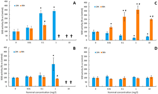 Mean values of SOD activity in larvae of D. labrax after 24 and 96 h exposure to (A) Cu, (B) Cu-NPs, (C) As, and (D) As-NPs (data are shown as means ± SD versus controls; symbols indicate significant differences as follows: (*) p < 0.05 vs. control; (#) p < 0.05 vs. 24 h). The crosses indicate that all larvae died at this concentration.
