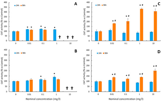 Mean values of CAT activity in larvae of D. labrax after 24 and 96 h exposure to (A) Cu, (B) Cu-NPs, (C) As, and (D) As-NPs (data are shown as means ± SD versus controls; symbols indicates significant differences as follows: (*) p < 0.05 vs. control; (#) p < 0.05 vs. 24 h). The crosses indicate that all larvae died at this concentration.