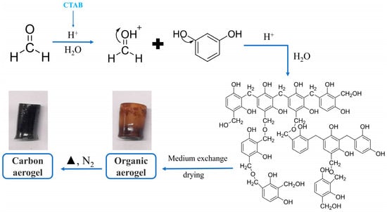 The preparation of CAs was based on the sol–gel polymerization method [35]. Briefly, a predetermined amount of resorcinol (R), 37% formaldehyde solution, cetyltrimethylammonium bromide (CTAB) and deionized water were added into a glass beaker, while stirring well at room temperature for 30 min, and then transferred into a glass vial. The vial was sealed and placed into an oil bath pot at 85 °C for 5 days, and the obtained organic aerogel was cured at room temperature for 2 days, followed by 60 °C for 24 h and then 105 °C for 3 h in an oven. Finally, the dried organic aerogel was heated to the point of carbonization with a set heating rate and residence time in a tube furnace. The molar ratios of R/CTAB were from 50 to 500, the carbonization temperatures ranged between 700 °C and 800 °C, the heating rates were 2 °C/min and 5 °C/min, respectively, and the residence time was in the range of 1 h to 2 h, respectively. They were denoted as CAa-b-c-d, where a represented the molar ratio R/CTAB, b represented the carbonization temperature, c represented the residence time, and d represented the heating rates. The specific preparation process is shown in Figure 1.