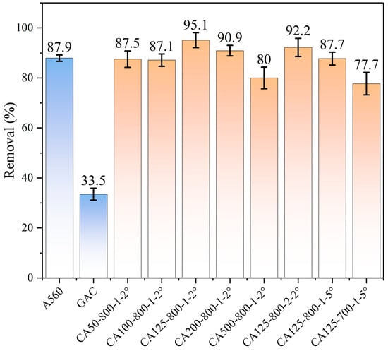 A series of experiments for CA preparation were performed to optimize the 1,4-D removals using CAs. The CAs’ synthetic conditions included the R/CTAB ratio, pyrolysis temperature, residence time and heating rate. As Figure 2 showed, the concentration of 1,4-D is 20 mg/L with an addition amount of CAs at 60 mg and an adsorption volume of 10 mL at room temperature (298 K). The preparation conditions affected the 1,4-D removal greatly. A560 and GAC were used as controls, and the removal amounts were 87.89% and 33.47%, respectively. All CAs showed much higher removal than GAC. The R/CTAB ratio varied from 50 to 200, and the highest 1,4-D removal was obtained at R/CTAB = 125, which was 95.08%. When the pyrolysis temperature increased from 700 °C to 800 °C, the 1,4-D removal increased first and then decreased. The optimum temperature was 800 °C. Similarly, there was some variation from 1 h to 2 h. The optimum residence time and heating rate were 1 h and 2 °C/min, respectively. Therefore, the optimum CA candidate was CA125-800-1-2°. The removal of 1,4-D reached a high percentage of 95.08%, which was 1.1 times higher than that of A560 and 2.8 times higher than that of GAC, respectively. For the sake of convenience for later descriptions, the following discussion uses CA125 referring to CA125-800-1-2°.