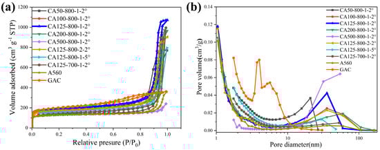 Characterizations of CAs, A560 and GAC: nitrogen adsorption–desorption isotherms (a) and pore size distribution (b).